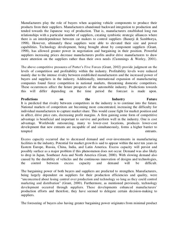 The major goal of this paper is to provide a detailed analysis of automobile industry that gives a clear description of the industry today and its prospects for the future. Due attention should be paid to the use of the strategy tools and theories, such as Porter’s five forces and PESTEL analysis and other approaches.